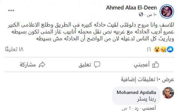 فضلاً، ساهم في تطوير هذه المقالة من خلال إضافة مصادر موثوقة. أكدت وسائل إعلام مصرية، يوم الثلاثاء، تعرض الإعلامي عمرو أديب لحادث سير ونقله إلى المستشفى. عمرو عبدالجليل عرابي زوج عزة. كشفت التحريات عن تفاصيل جديدة في حادث تصادم سيارتين إحداها قيادة الإعلامي عمرو أديب بمدينة 6 أكتوبر، الأربعاء. البرلمان يوافق نهائيا على اللائحة الداخلية لمجلس الشيوخ.